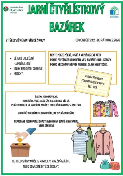 Přijďte dětem i sobě vybrat něco pěkného. Oblečení, obuv, knížky a další drobnosti.